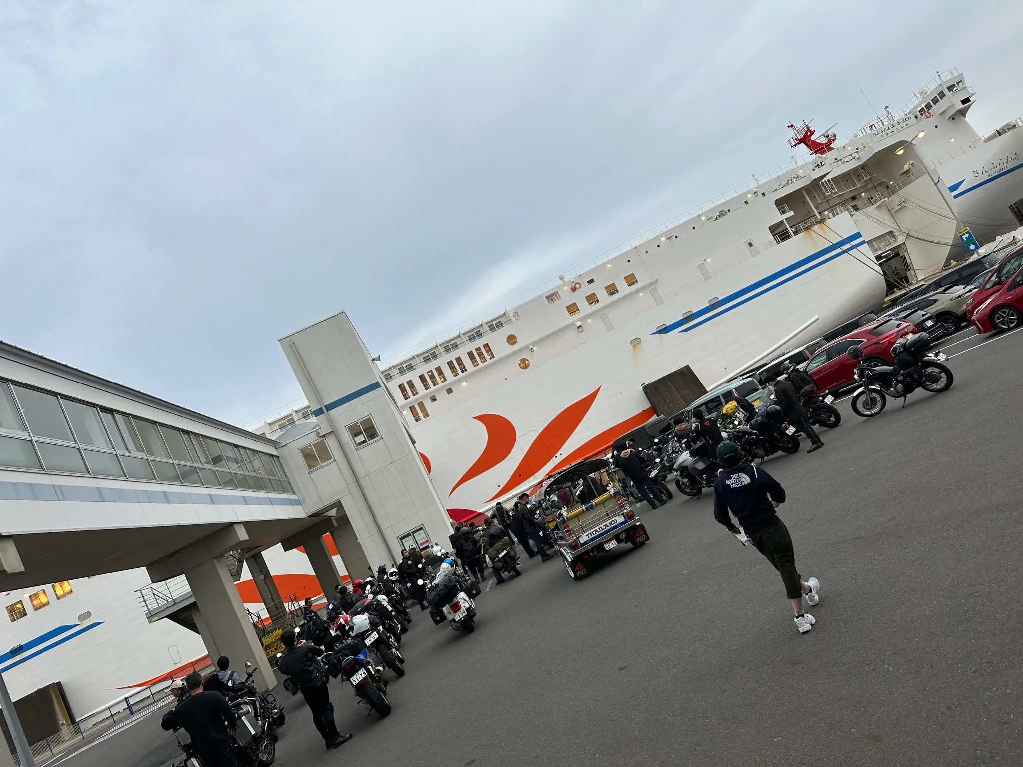 夕方、大洗港での整列を終えて乗船。繁忙期にはたくさんのバイクが!テンションがあがります!!